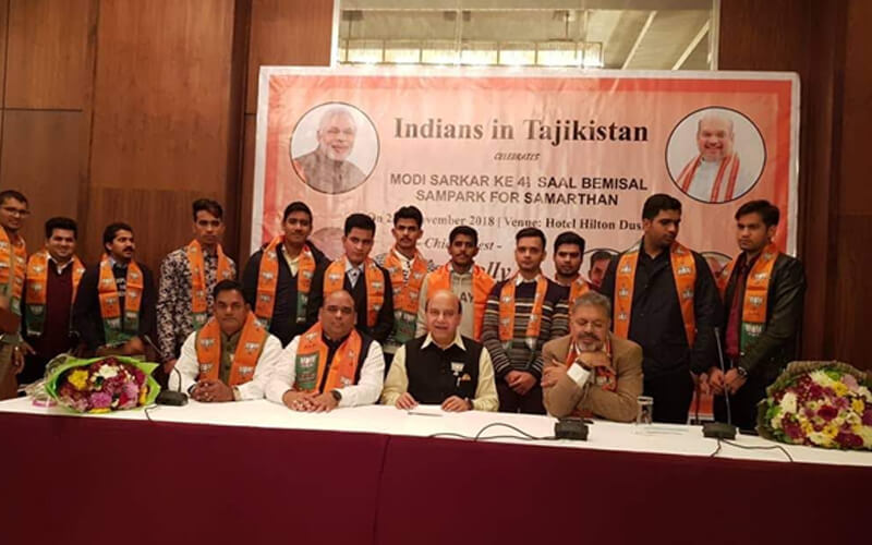 Taj Mohammed is with their supporters and team at the campaign “SAMPARK FOR SAMARTHAN” and “MODI KEY 5 SAAL BEMISAAL” Program in Dushanbe-Tajikistan.
